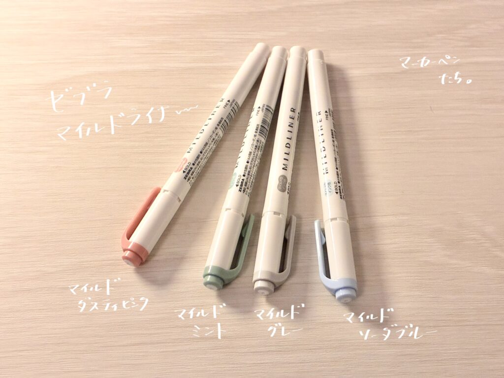「おだやか色」のマイルドライナー。手帳や文房具好きな人なら一度は目にしたことがありそう。私も影響を受けて買ったひとり。どんな気分のときにも合う落ち着いた色でほんとうに使いやすい。飾り文字やチェックボックスとして使うことが多い。イラストを描くことも。