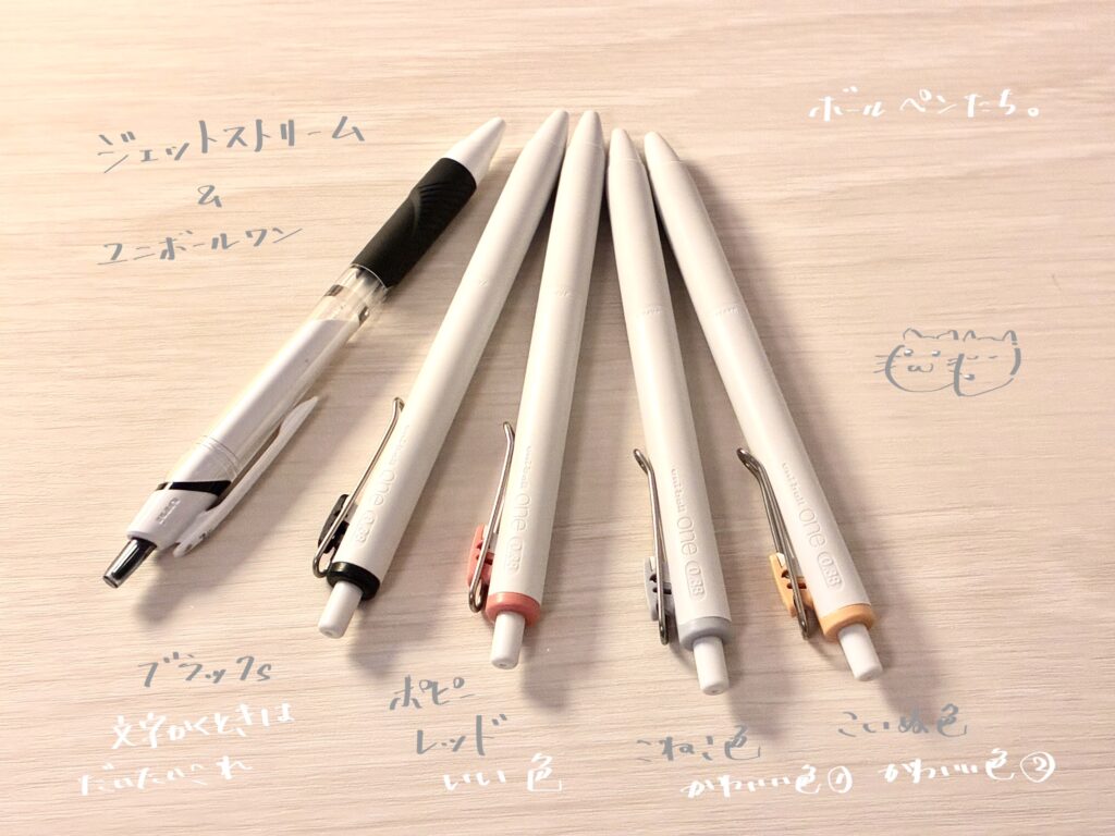 ボールペンは手帳を始めるとき買ったユニボールワンが好きでずっと使っている。書き心地がよく、色もいい。最初の文字色だったブラウンブラックはすでに使い切ってしまった。