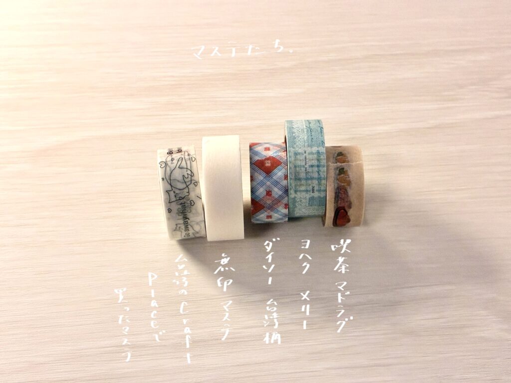 手帳デコに使ったり、のりで貼ったものをさらに補強するときに使うマステ。どれもお気に入りだが、ローソンで買った無印の白マスキングテープがいろいろと使いやすくてびっくりした(手帳以外の用事でも使っている)。
